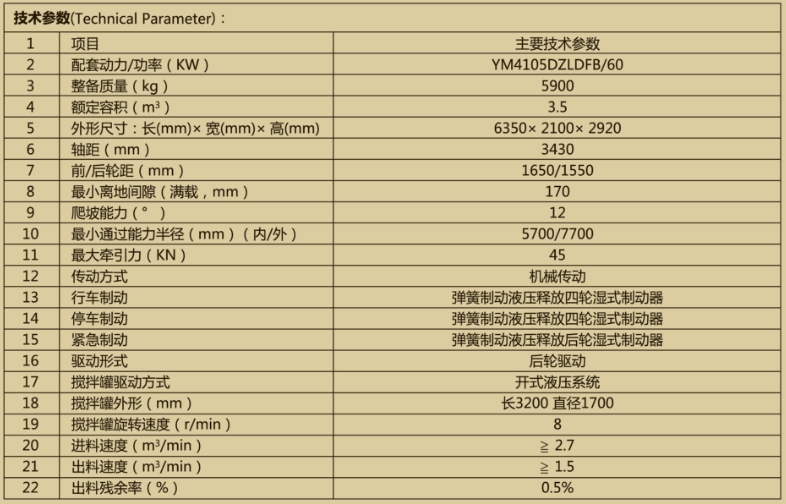 該車配套YM4105DZLDFB防爆柴油機,機械傳動,后輪驅(qū)動,液壓助力轉JC3.5防爆柴油機混凝十攪挫運輸車向;制動系統(tǒng)為全液壓濕式制動器。車架采用專用工程車底盤,攪拌罐采用耐磨鋼材質(zhì),是一款適合于礦山井下運輸混凝士的專用車輛。