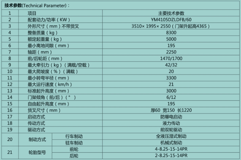 CPCDB50防爆柴油機平衡重式叉車采用中國一拖集團CPCD50叉車底盤,配裝本公司生產(chǎn)的YM4105DZLDFB防爆電噴柴油機為動力,行走系統(tǒng)采用液力傳動變矩器加動力換擋變速箱,操作輕松,自適應(yīng)能力強,舉升采用雙油缸頂舉,操作平穩(wěn);行車制動采用前輪濕式制動器,滿足坡道制動要求。整機設(shè)計合理,結(jié)構(gòu)緊湊,適合于井下叉裝較大部件使用。