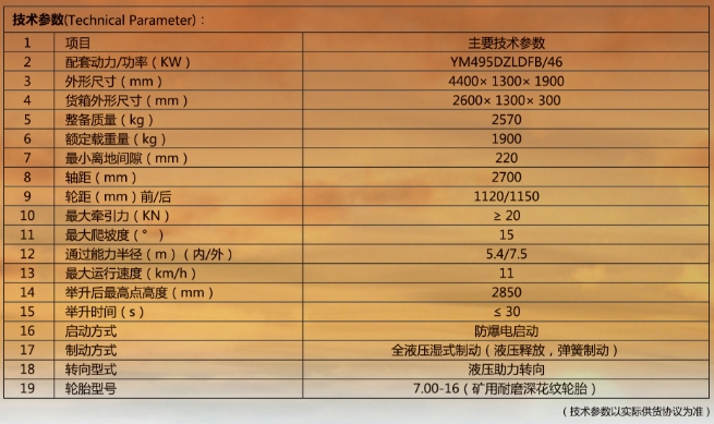 WC1.9J(B)防爆柴油機無軌膠輪機車,配套本公司生產(chǎn)的YM495DZLDFB防爆柴油機為動力、機械傳動、液壓助力轉(zhuǎn)向、全液壓濕式制動,適用煤礦井下運輸作業(yè)。機車具有雙向行駛功能,配套實芯輪胎,結(jié)構(gòu)緊湊、外開小、牽引力大、爬坡能力強、操作方便等優(yōu)點,可作為井下順槽車使用。